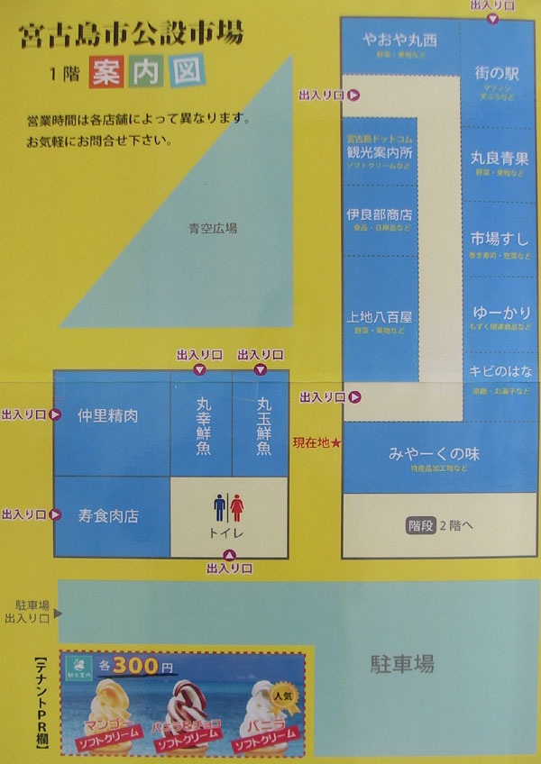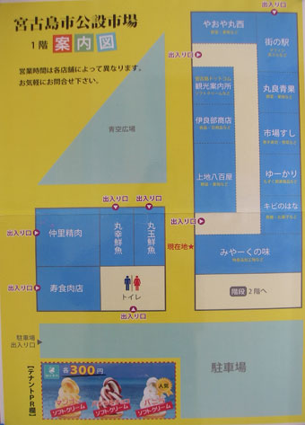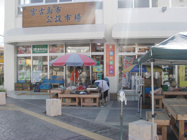 市場の建物には17店舗が入居している。1階には▽市場の駅▽丸良青果▽まるにし青果▽市場すし▽ゆーかり▽キビのはな▽みゃーくの味加工推進協議会直売所▽上地八百屋▽伊良部商店▽宮古島ドットコムが営業している。また2階部分には飲食店「眞茶屋」が営業している。