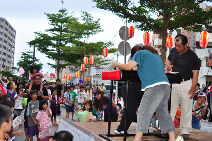宮古島夏まつりが市内3通り会で24日行われ、大勢の親子連れで賑わいを見せた。夏まつりではパレードや宮古角力大会、第37代ミス宮古発表会などのほか多くのアトラクションで賑わった。下里通りで行われた大綱引きでは、一対一の熱戦から最後に西軍が勝ち今年の「大漁」が祈願された。